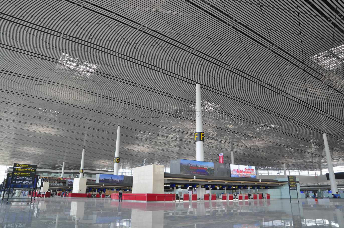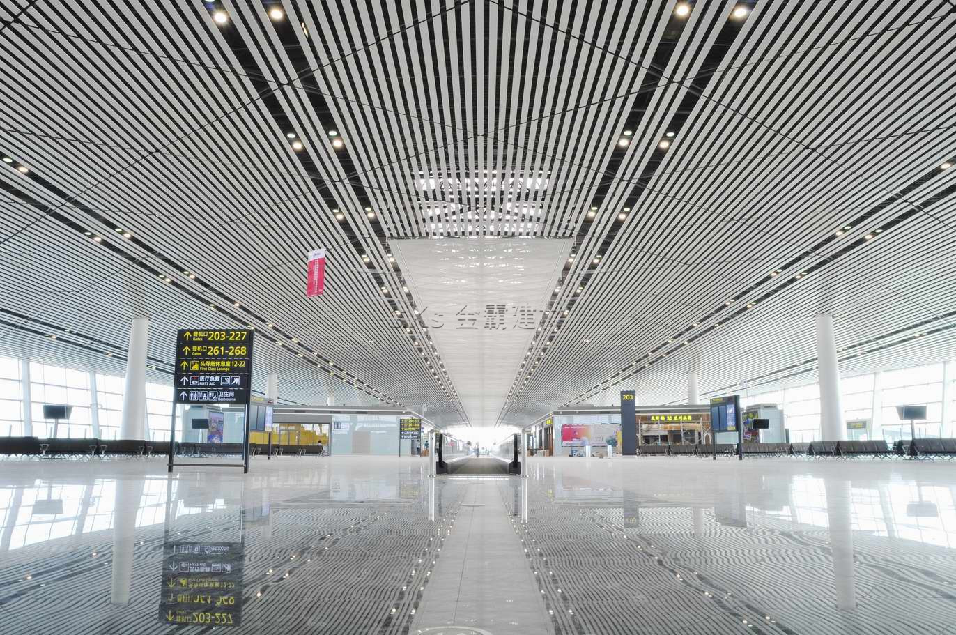 T2航站楼采用“风筝”造型设计,屋面平缓宽阔,出发大厅空间开阔充足,大吊顶全部采用导向性十分明确的白色细长条形铝板,颜色简单素净,线条流畅,具有丰富的层次美感,从出发大厅至安检区,直至指廊端头。配合航站楼屋顶的多个大天窗设计,通透明亮,环保节能,贴合现代环保理念。