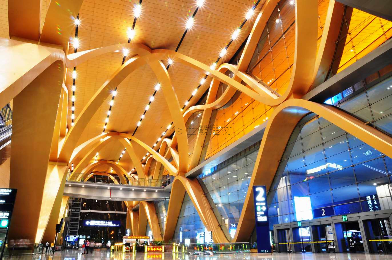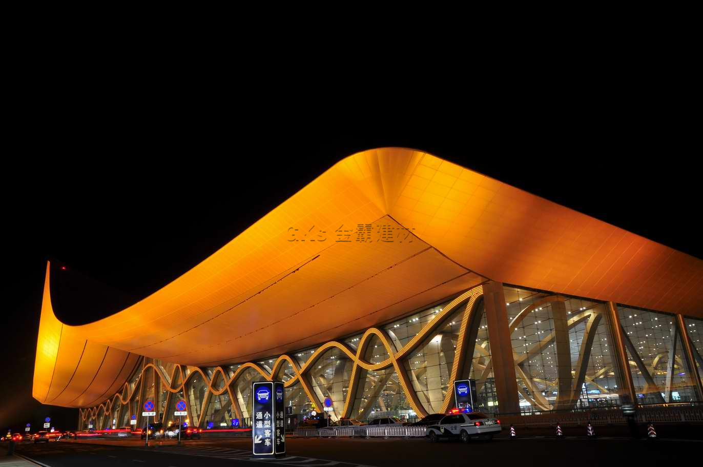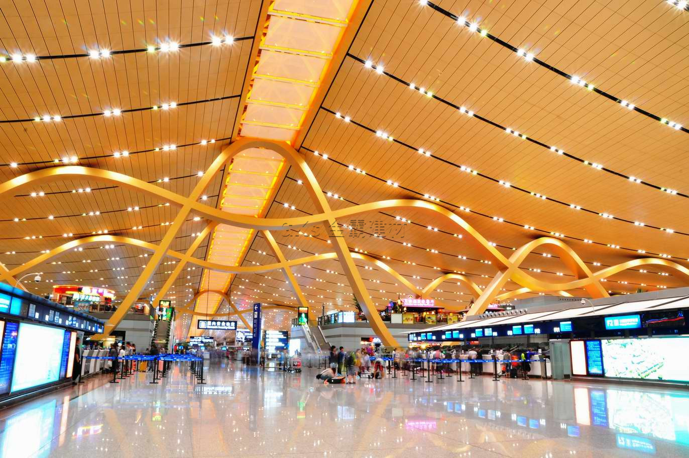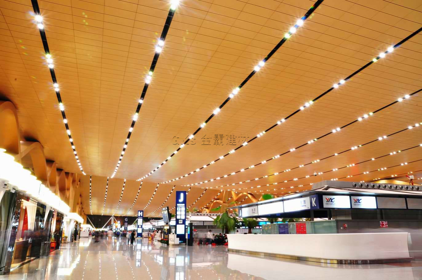 自顶端挑檐开始绕整个航站楼一周,在屋面和室外吊顶之间区域,全部用特制的金色蜂窝铝板覆盖。每一件蜂窝铝板尺寸都不相同,每一件蜂窝铝板都是扭曲的双曲特殊造型,连接自然平整,整个屋面系统浑然一体。室内广阔的空间正处在两扇巨翼的下方,形成两个巨大的曲面,而镶嵌成这两个曲面的吊顶材料是金霸乐鱼(中国)®定制的金色冲孔铝单板,一件件严丝合缝地组装成一个个单元。吊顶面整体弧度非常圆润顺滑。每当夜晚时分,天窗软膜天花内的灯光映照着巨大的金色的顶面,和室内那一条条蜿蜒如彩带飘舞的金色钢结构梁互相辉映,整个大厅金碧辉煌,美轮美奂。