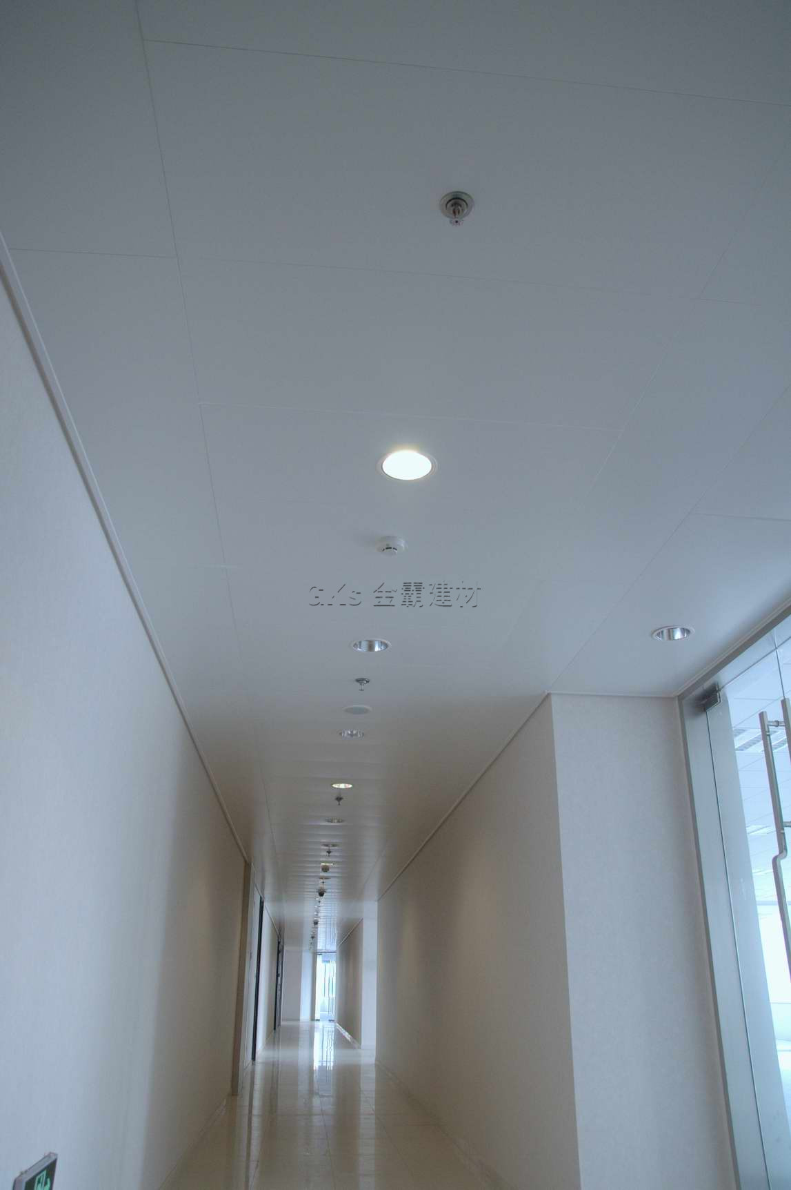 东方金融广场整体装饰设计现代、大气,楼内办公楼层吊顶采用简洁素净的白色矩形铝板吊顶,板块平整度高,板缝顺直平滑,装饰整体感十分突出。