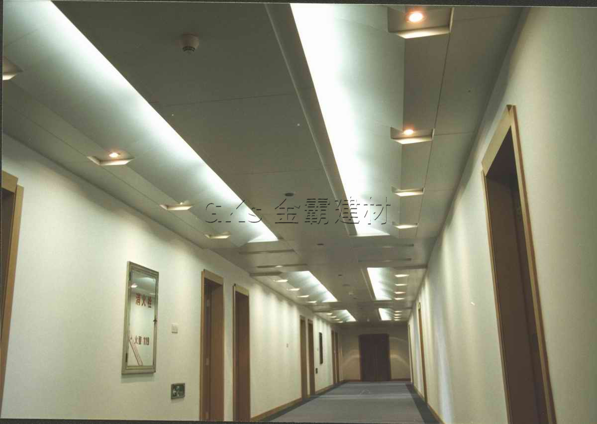 江苏人大会议中心会议大厅吊顶装饰庄严而华丽,半圆水纹造型吊顶自中心讲台位置向外层层扩散,每一层半圆吊顶同时曲面向上收起,隐藏的照明灯槽散发的光照让吊顶宛如一个个光环,照耀着群众。中心的大堂中央采用天井式的天然采光,顶部透光天窗下,一楼的天花及二楼天井位置墙壁均采用铝单板吊顶及墙板,美观耐用,雅致大方。办公区域走廊的铝板吊顶更突显了造型灵活的特性。