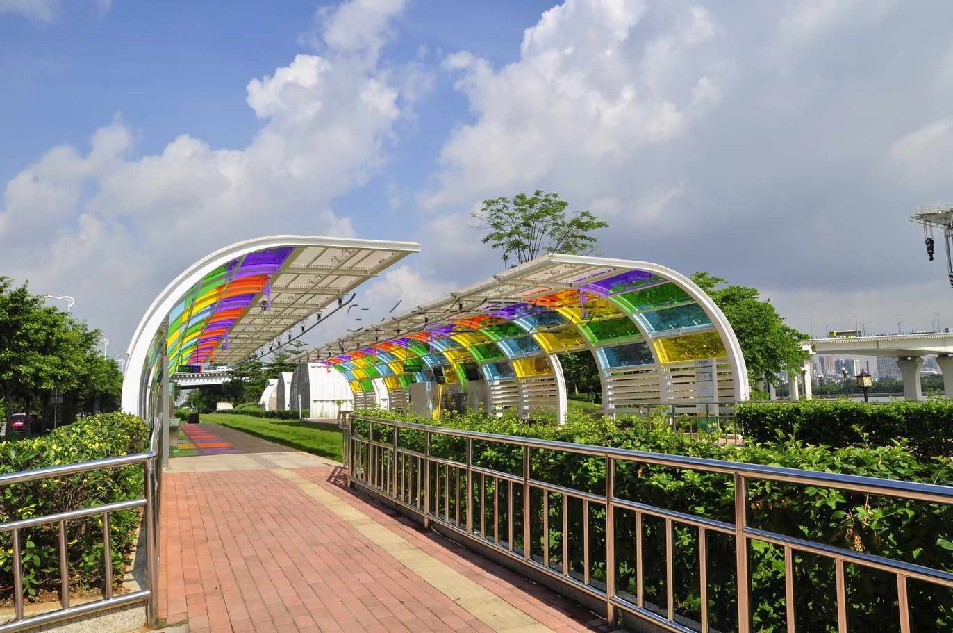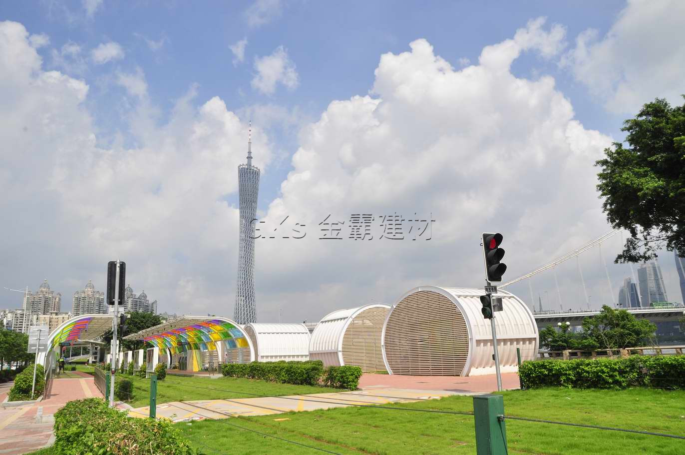 海珠有轨电车10车站都具有鲜明的个性,与沿江景色长廊美丽的环境和谐一致。每个车站屋面及设备墙饰面均采用金霸乐鱼(中国)®氟碳铝单板;各个车站设有充电模块(储电站)为电车停站充电,每个充电模块用铝合金弧形方通和冲孔板精心包裹,椭圆形外观看上去酷似 白色“蛋卷”。万胜围总站的大型储电站,不规则四边形外墙采用黑白色彩氟碳铝板,极具现代设计特色。车站的彩色玻璃棚顶与大型铝合金百叶窗,也兼备了透视美观以及通风遮阳的实用功能。