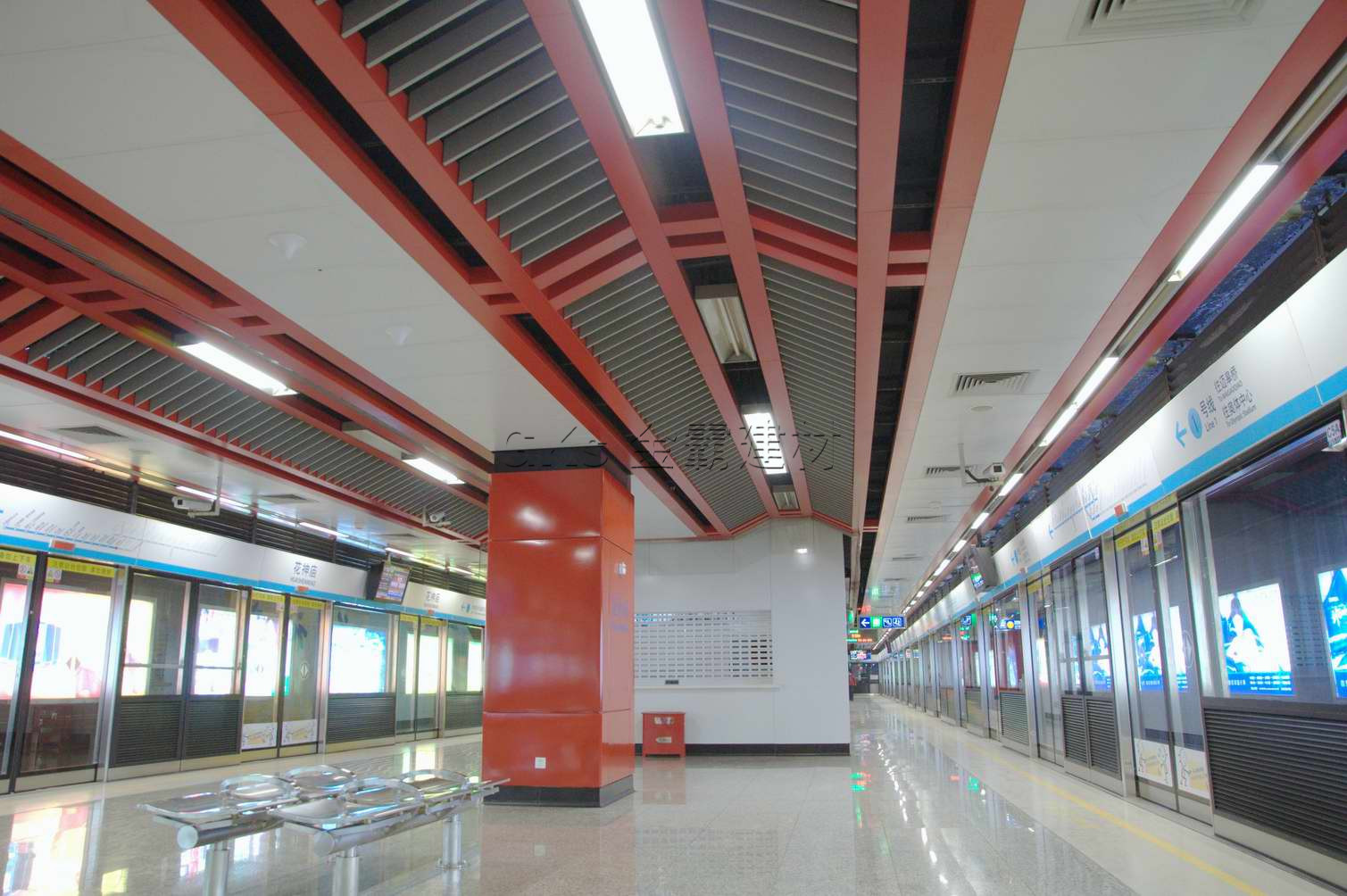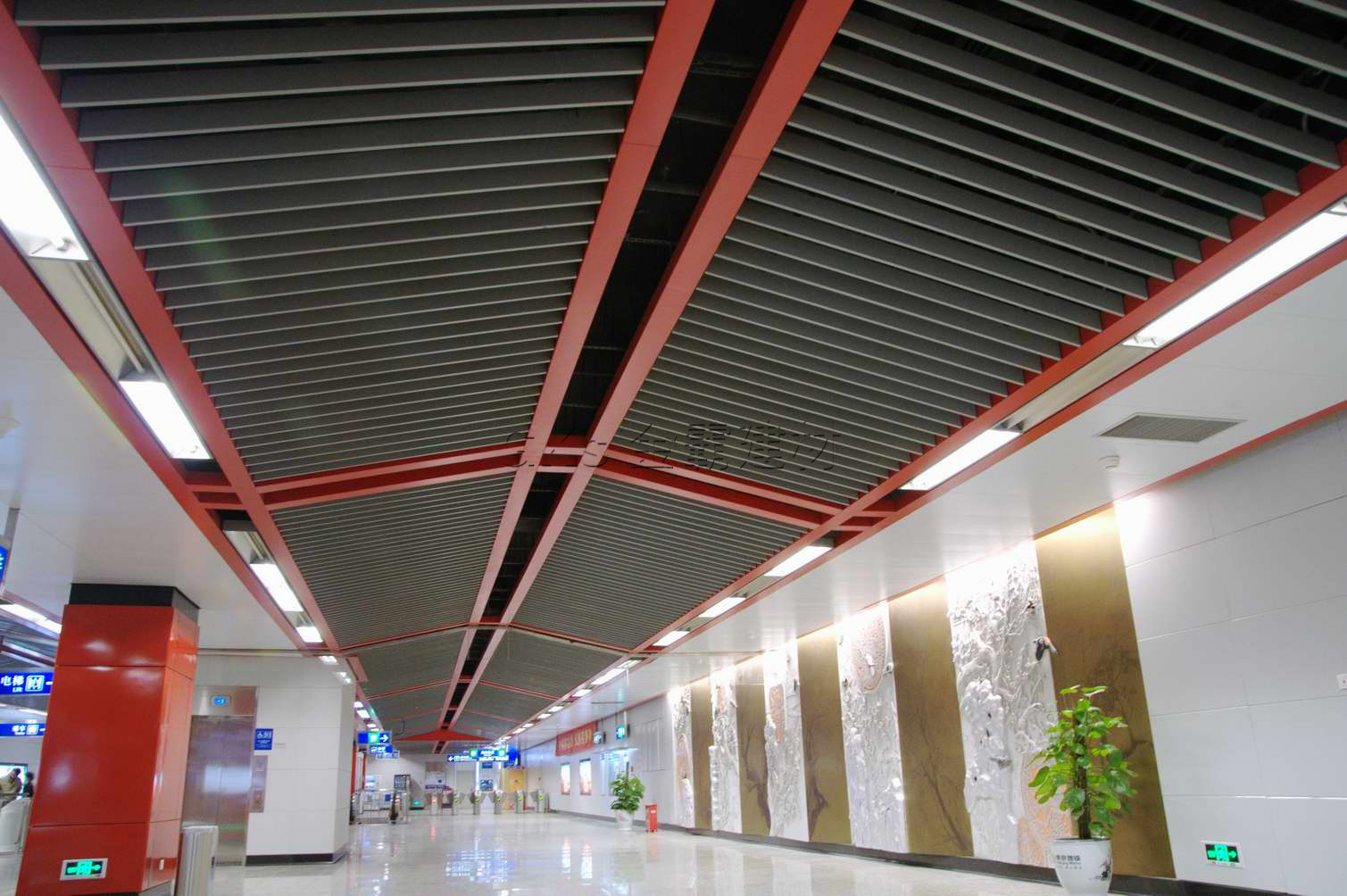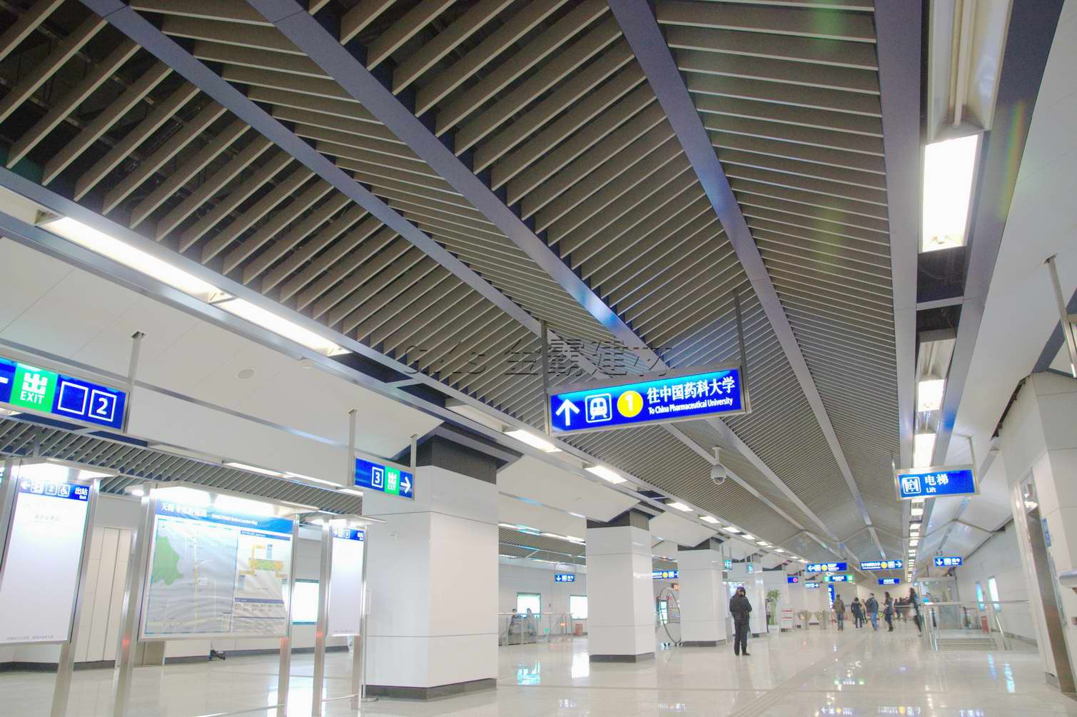 南京地铁站的吊顶装饰,以垂片和条板为基本装饰元素,每个站台根据各自的地域特色,对重要位置进行个性化设计。如2号线大行宫站,两边是素净的条板,中央位置有一个突出的橙色井字型天井式天花,镂空的中央部位悬挂着照明灯具,像一个巨大的灯盘。1号线花神庙站的仿古屋顶造型与朱砂色龙骨围边,形象地体现了中国古代庙宇的典型造型,与地标建筑遥相呼应。新街口站妆如其名,一个个由铝板组合而成的“方盒子”吊顶及灯盘,呈一定规律的造型排列,新颖独特,如一件带有未来感的艺术品,正好贴切“新”字的涵义。