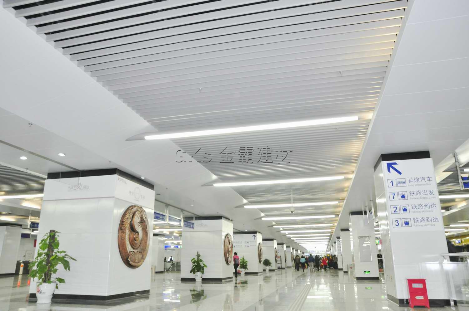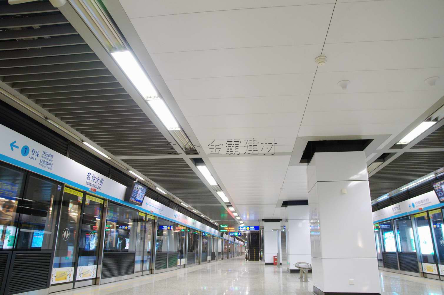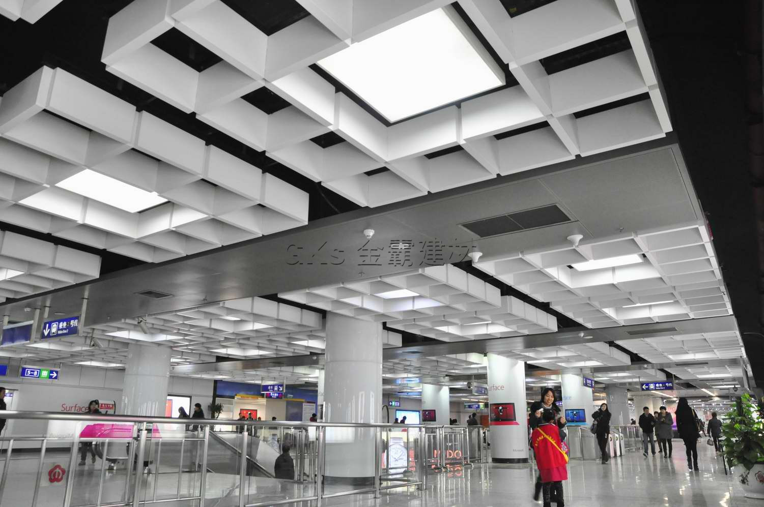 南京地铁站的吊顶装饰,以垂片和条板为基本装饰元素,每个站台根据各自的地域特色,对重要位置进行个性化设计。如2号线大行宫站,两边是素净的条板,中央位置有一个突出的橙色井字型天井式天花,镂空的中央部位悬挂着照明灯具,像一个巨大的灯盘。1号线花神庙站的仿古屋顶造型与朱砂色龙骨围边,形象地体现了中国古代庙宇的典型造型,与地标建筑遥相呼应。新街口站妆如其名,一个个由铝板组合而成的“方盒子”吊顶及灯盘,呈一定规律的造型排列,新颖独特,如一件带有未来感的艺术品,正好贴切“新”字的涵义。