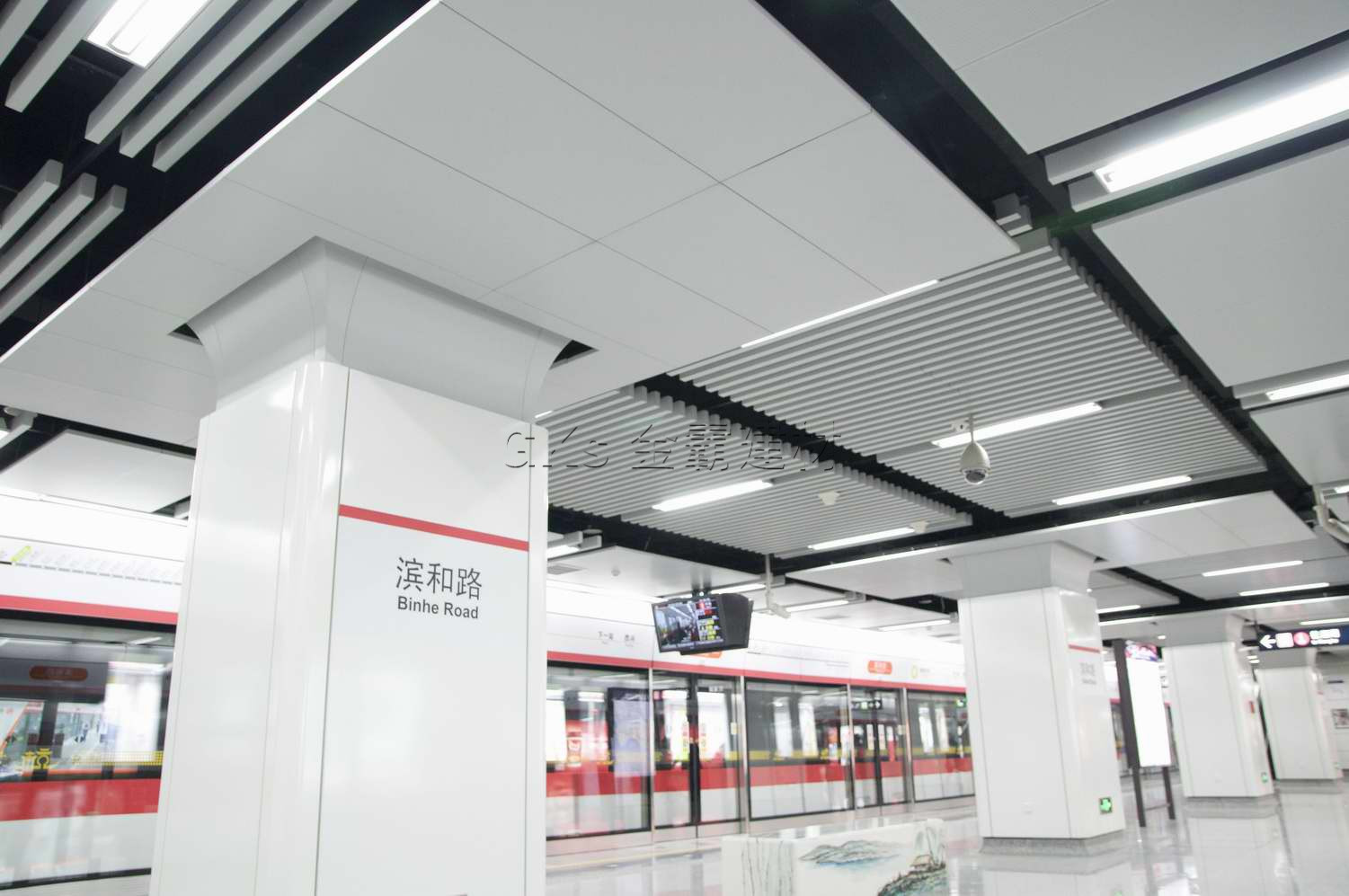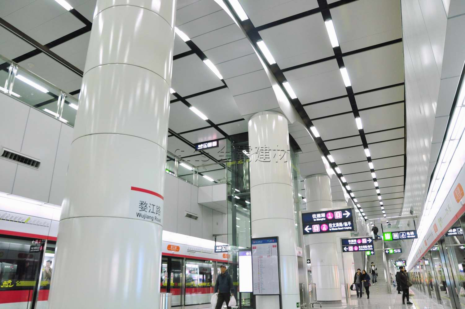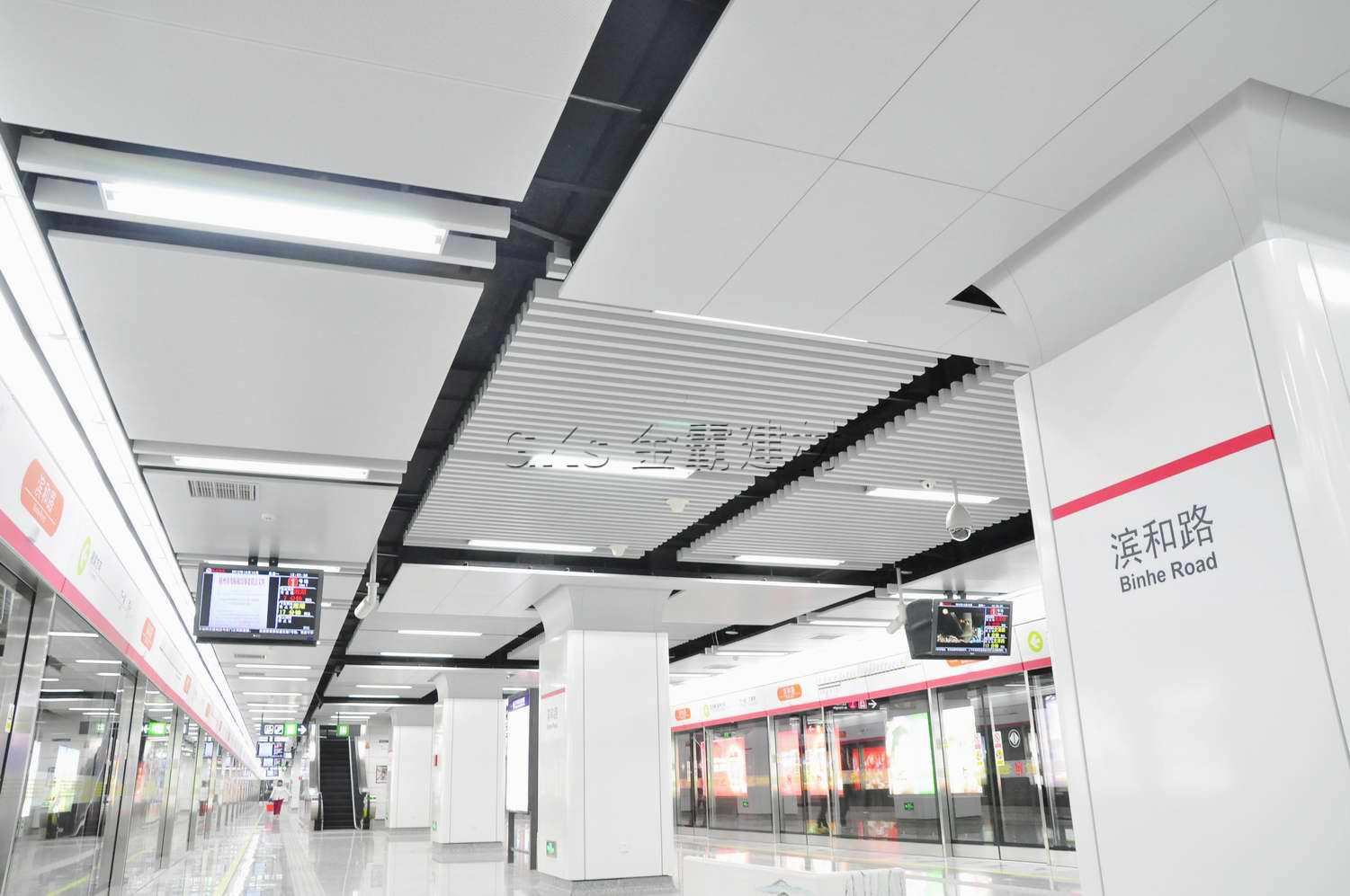杭州1号线地铁,站台站厅装饰统一以白色为基调,凸显明亮、素净、高雅的格调,而在每个站的吊顶造型上巧露心思,设计出富有特色的方案。如近江站,黑白分明的向两端延伸垂片吊顶中央,是一整排由铝板镶嵌而成的多个不规则四边形,块状的四边形与黑白分明的细致线条形成强烈的对比。滨和路站则以铝方板和垂片各自组成多个方块吊顶,彼此相邻,高低相隔排列,充满现代时尚的美感。湘湖站的吊顶采用了强烈的简洁风,两侧白色垂片吊顶,中间大部分为相隔距离约宽度1/2的宽矩形铝板,拼接并贯穿站厅与站台的两端,中间有几组不规则相交的线条划过整齐划一的天花,给明快的线条增添了节奏感。