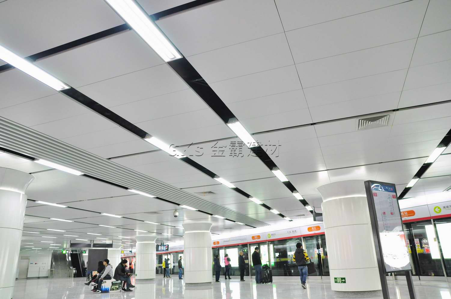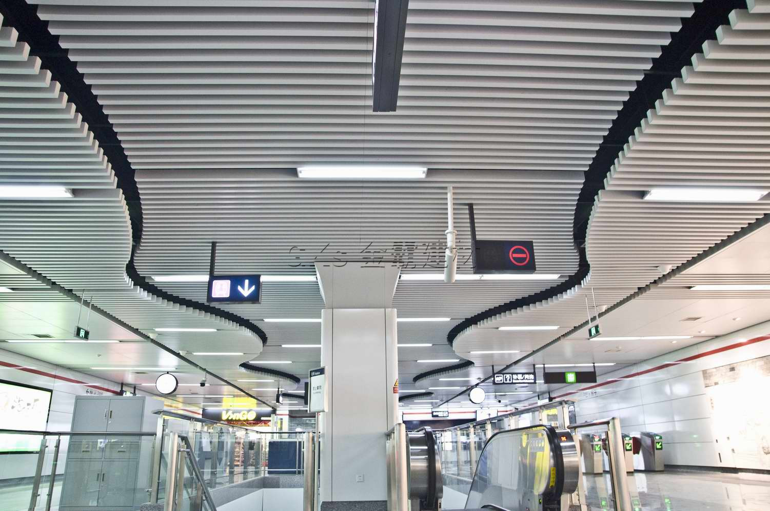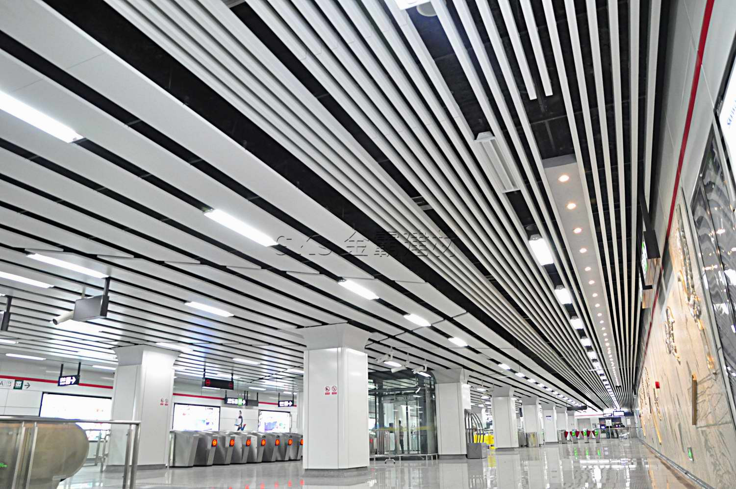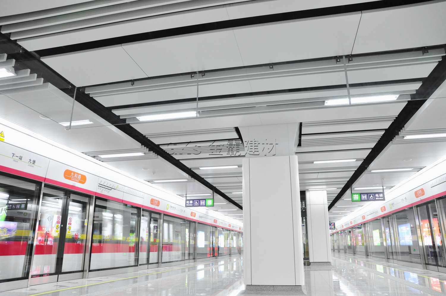 杭州1号线地铁,站台站厅装饰统一以白色为基调,凸显明亮、素净、高雅的格调,而在每个站的吊顶造型上巧露心思,设计出富有特色的方案。如近江站,黑白分明的向两端延伸垂片吊顶中央,是一整排由铝板镶嵌而成的多个不规则四边形,块状的四边形与黑白分明的细致线条形成强烈的对比。滨和路站则以铝方板和垂片各自组成多个方块吊顶,彼此相邻,高低相隔排列,充满现代时尚的美感。湘湖站的吊顶采用了强烈的简洁风,两侧白色垂片吊顶,中间大部分为相隔距离约宽度1/2的宽矩形铝板,拼接并贯穿站厅与站台的两端,中间有几组不规则相交的线条划过整齐划一的天花,给明快的线条增添了节奏感。