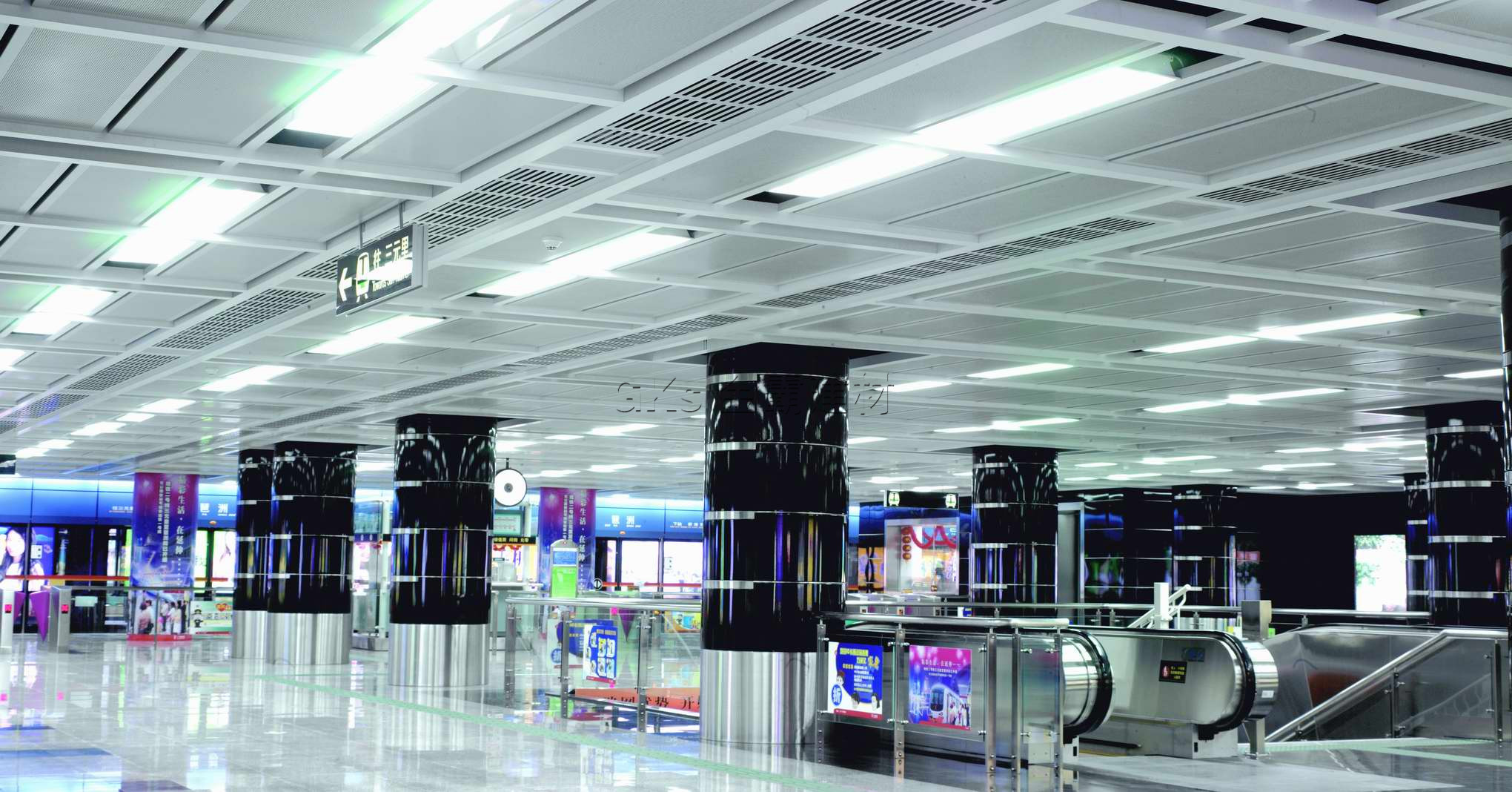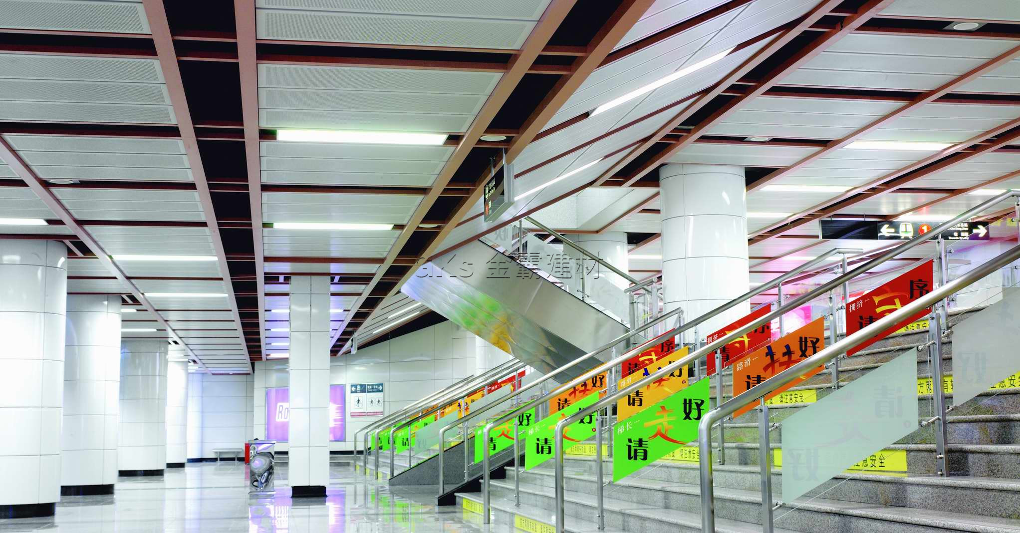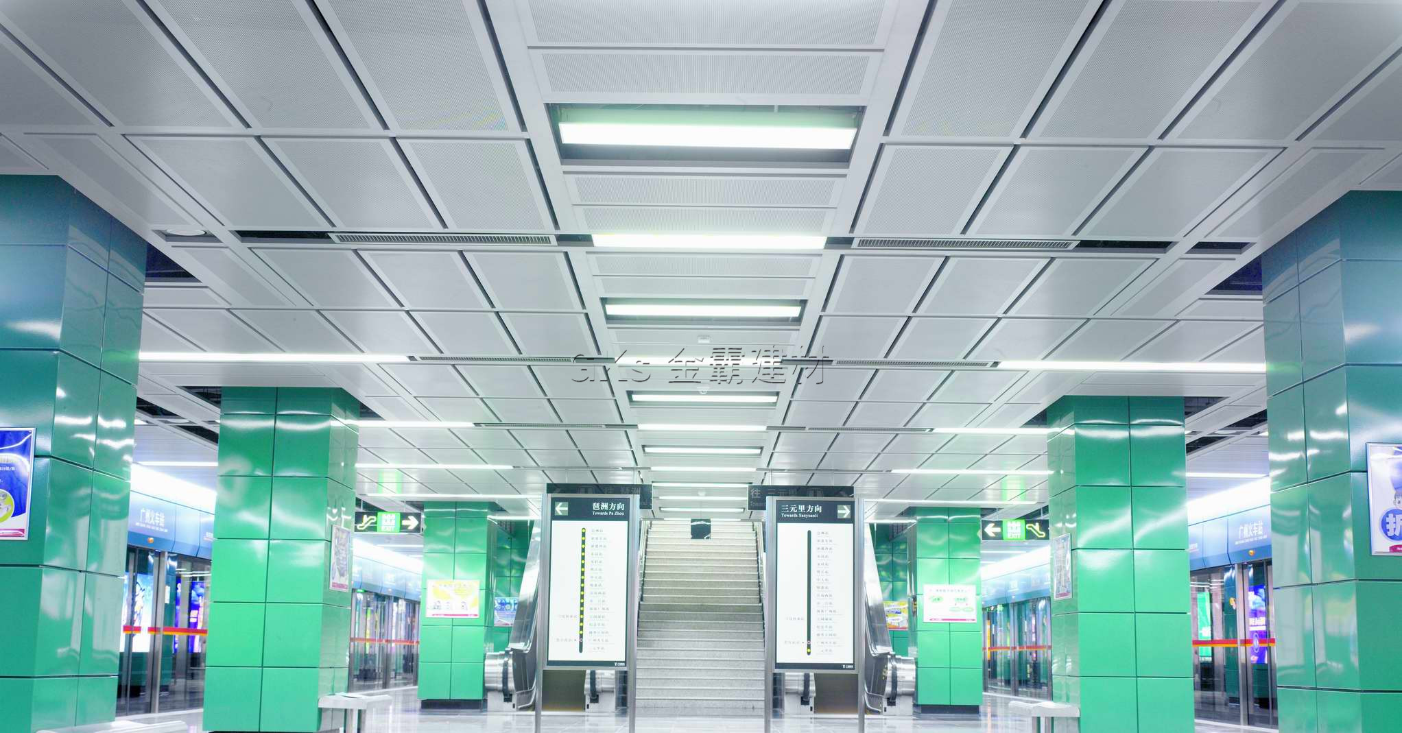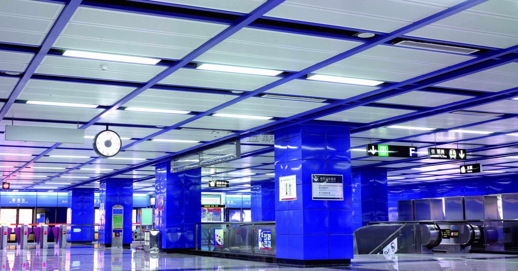 二号线全线吊顶创新性地采用标准化、模块化现代装修设计理念,一线一景而又不失各站特色。吊顶产品全部金霸乐鱼(中国)®专利技术的开启式冲孔铝板,与乐鱼(中国)®铝型材方通组合成模块式吊顶天花。所有冲孔板和铝型材规格一致,仅通过颜色的变化来突出各站不同个性。