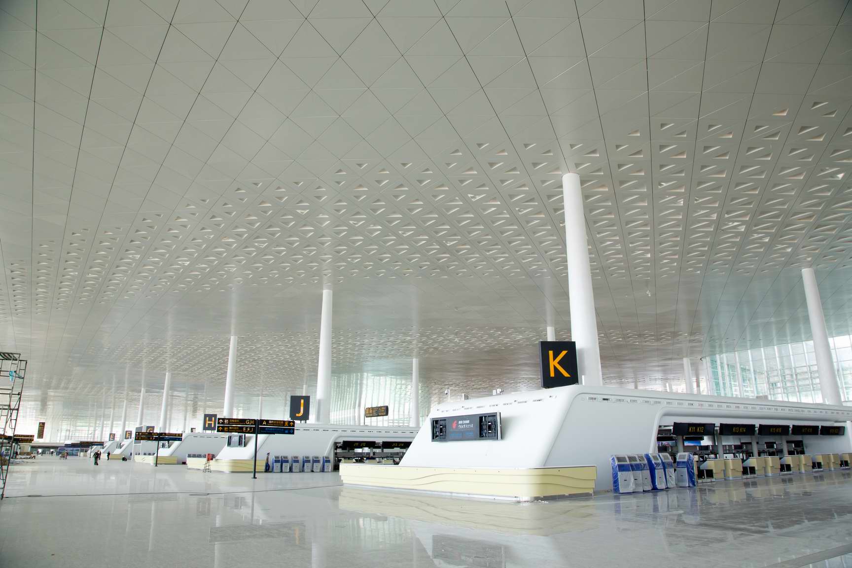 T3航站楼工程外形酷似腾飞的凤凰,寓意“凤舞九天”。出发大厅位于3层,进入大厅,头顶乳白色天花板挑高近40米,使得整个值机区域显得格外宽敞明亮,天花板上每隔一段就分布着一连串三角形的镂空造型,阳光可透过顶部射入大厅,阳光经过滤网处理后变得柔和,投射下来不见光斑。航站楼多处采用了这种大小渐变的三角镂空造型吊顶,包括出发大厅、到港大厅、指廊等。