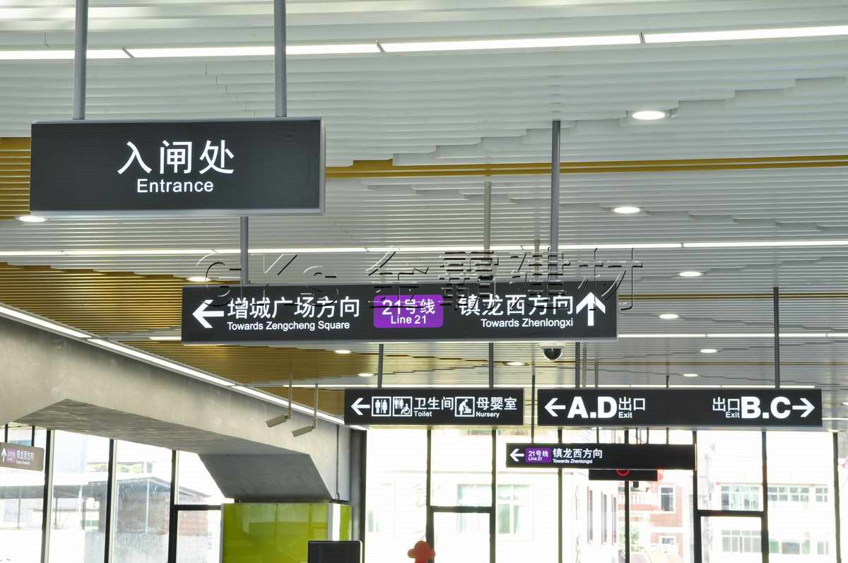 21号线增城广场站以“烟水绿·荔枝红”为主题,集中展示荔枝文化。车站用绿色的半弧型方通铝板和红色的柱面玻璃创造舒适的氛围,排列于红色玻璃柱两则的许多组半弧方通,宛如荔枝树的茂密枝叶,犹如在山水间浓厚的文化氛围中融入特色的荔枝红。