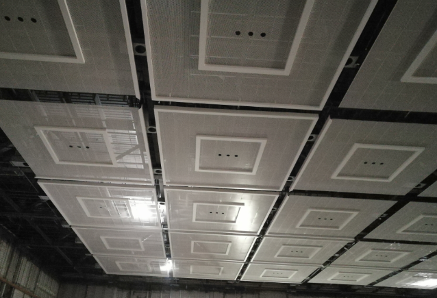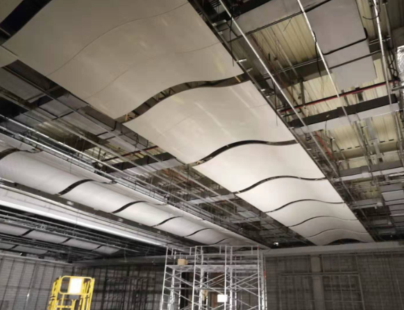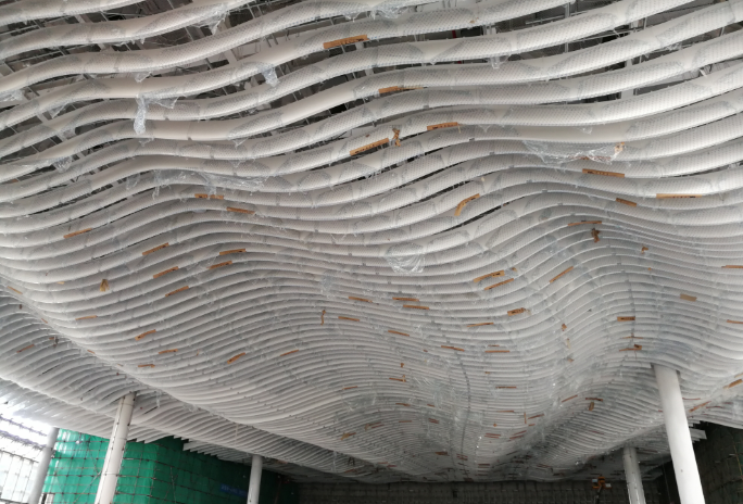 中心的室内吊顶也颇具特色,不同的展厅与功能房间都有不一样的设计,从下图可看出各种造型变化的室内吊顶,都密锣紧鼓地加紧安装当中。吊顶板块造型多变,加工的复杂性也成为了该工程供货的难度之一。