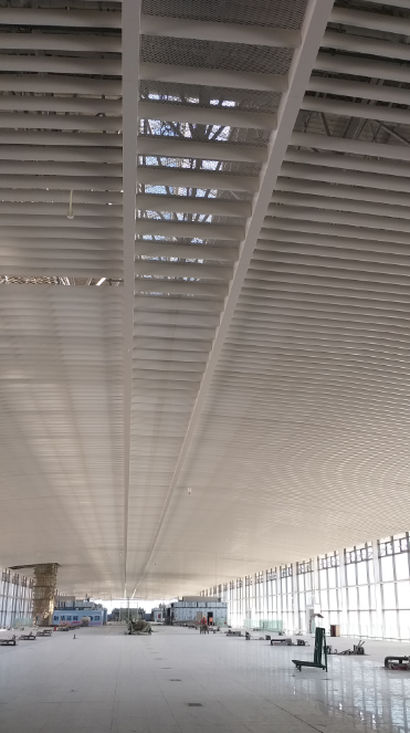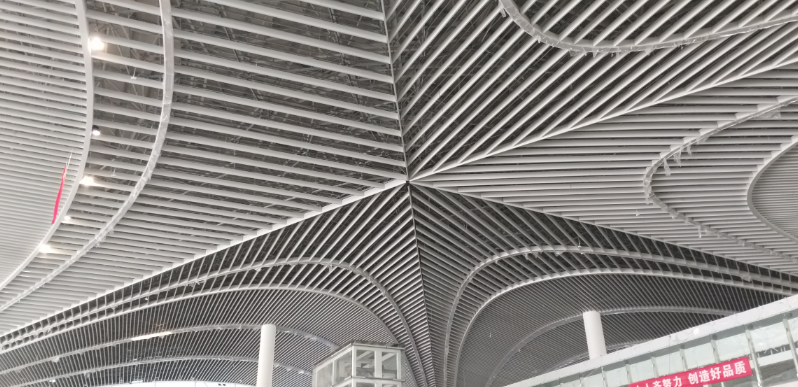 航站楼内部大吊顶,在设计上与建筑体外形保持一致,大厅中央上空,同样悬挂这一只巨大的生动的“海星”,并且随着指廊往外延伸。金霸计划为该航站楼供货约28万平方米,包括格栅、冲孔铝板、铝网板、墙柱饰面板、木纹铝板、异型板、双曲板等产品,覆盖了出发大厅、指廊和层间吊顶等位置的吊顶和墙柱饰面部位。