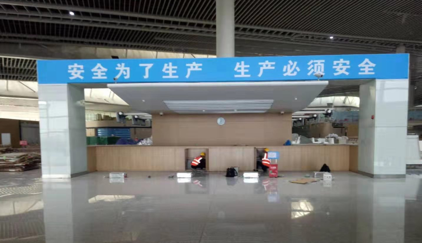 技术人员正在航站楼大厅值机岛安装木纹柜台和墙板