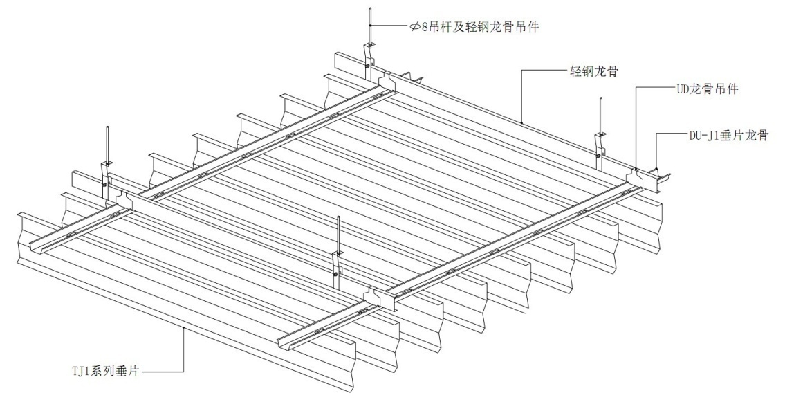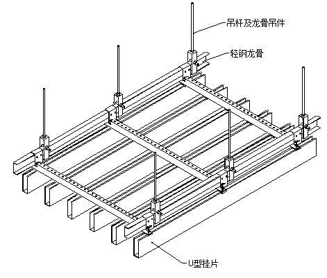 系统采用50轻钢龙骨和专用副龙骨纵、横排布,组成“井”字结构。